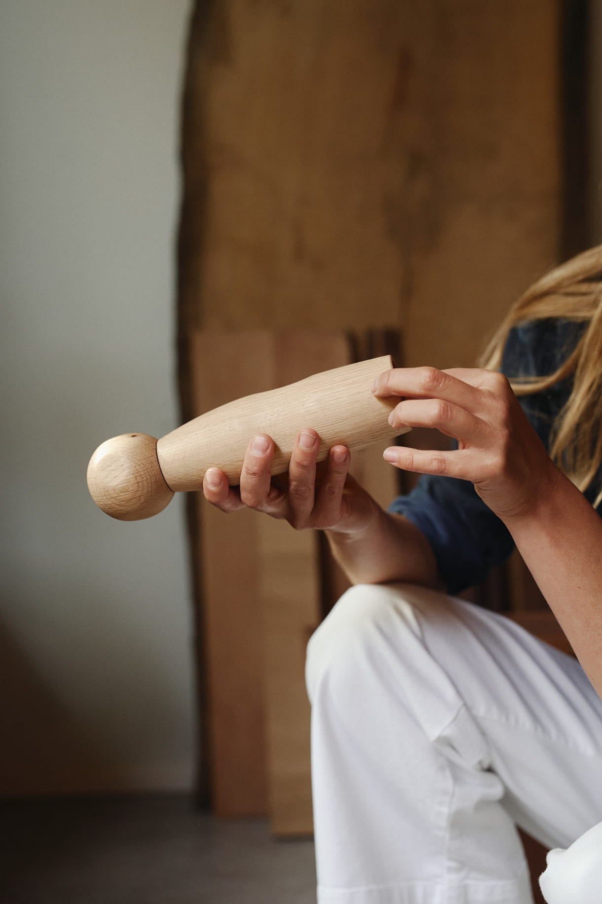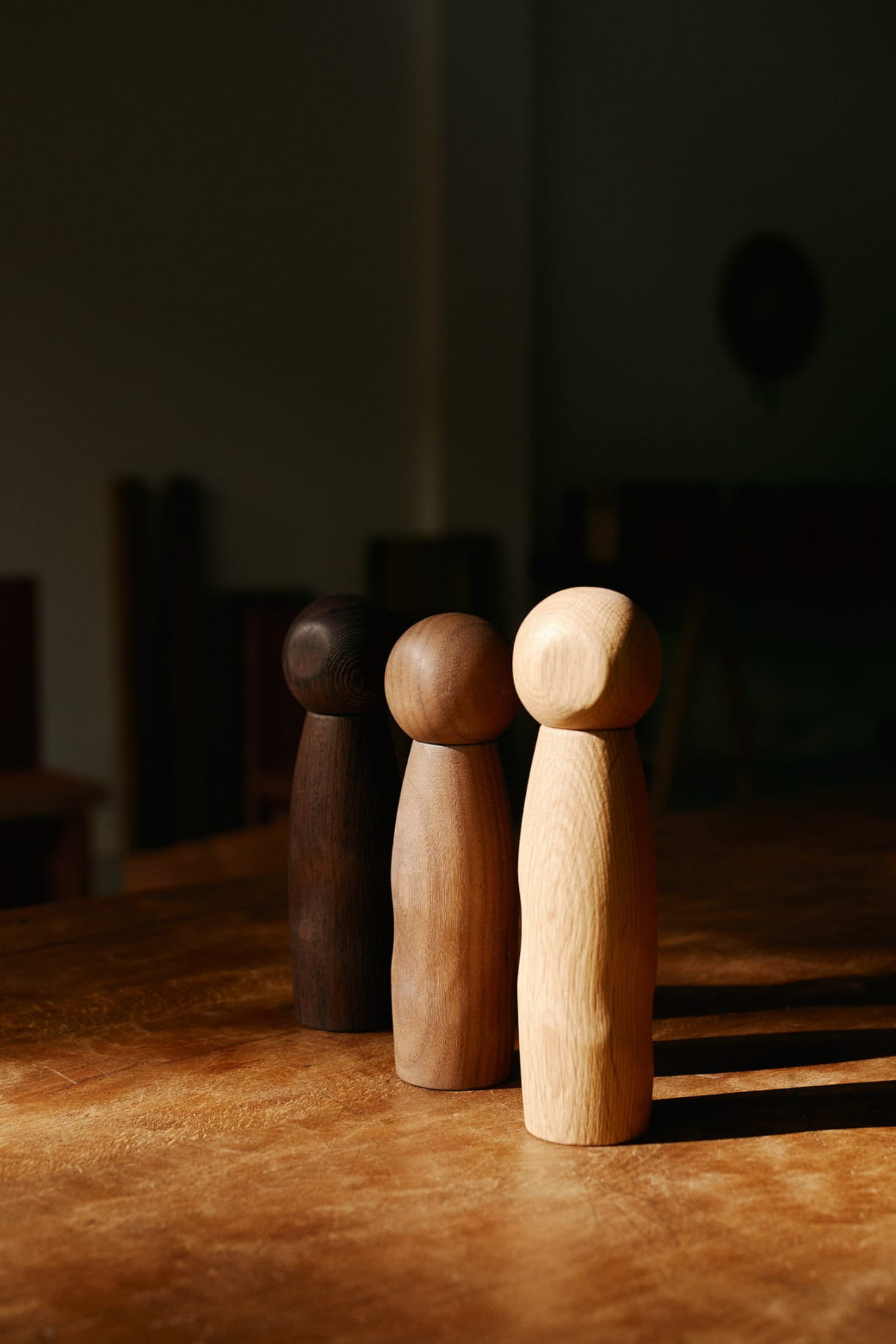 We often have scraps of solid wood when we make furniture for training courses, clients or interiors. We often have fun building furniture and objects with these offcuts, hence the irregular, organic shapes found in our pepper pots and stools.
