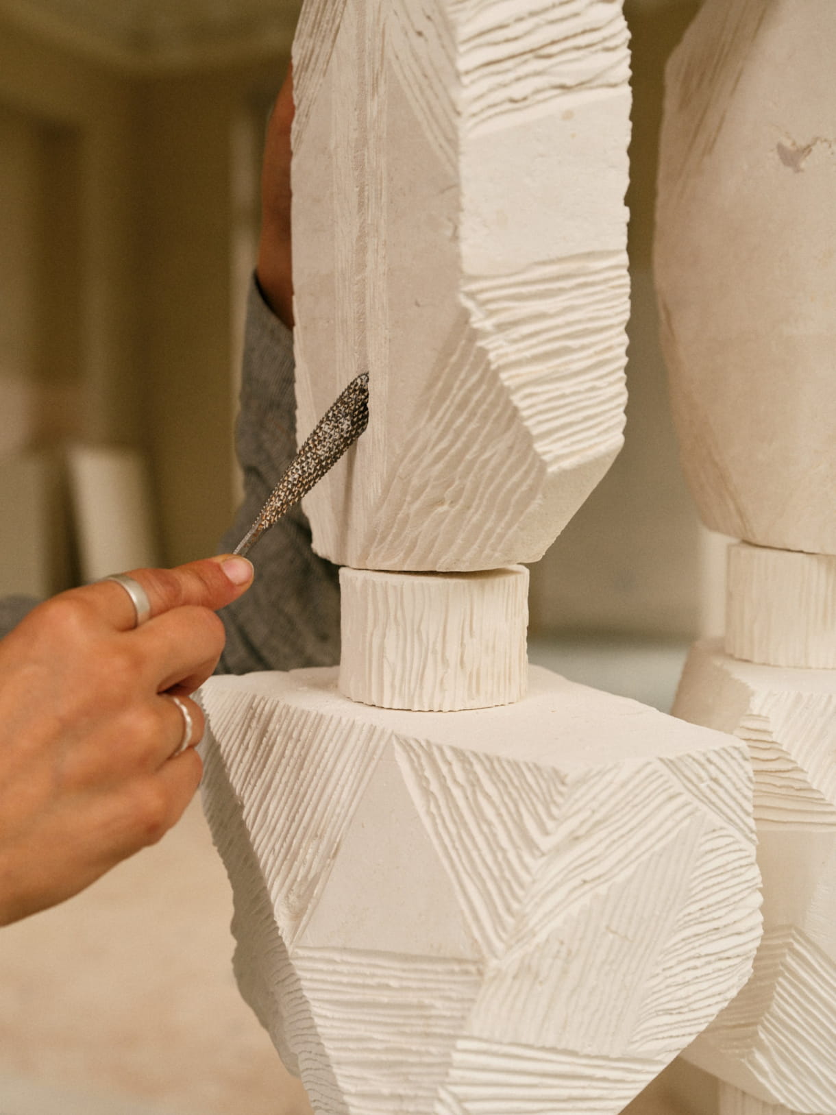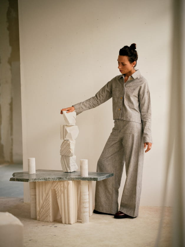 Audrey Guimard is a self-taught sculptor with a passion for stonework. Growing up in the mountains, surrounded by this material, has had a profound influence on her career. After studying art history and archaeology, she turned to museography, scenography and interior design, before discovering her true passion during an artistic residency in disused quarries. For the Sessùn flagship store in Paris, Audrey has designed a series of unique sculptures, ranging from seats to totems, as well as smaller pieces. Inspired by Sessùn's luminous, refined universe, she created works that interact with each other, celebrating natural materials and craftsmanship, while respecting the brand's timeless aesthetic.