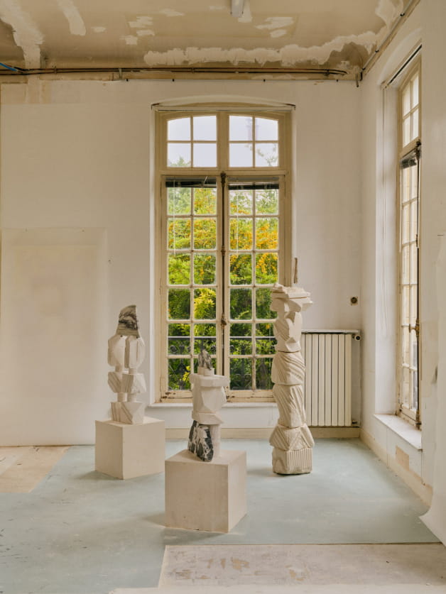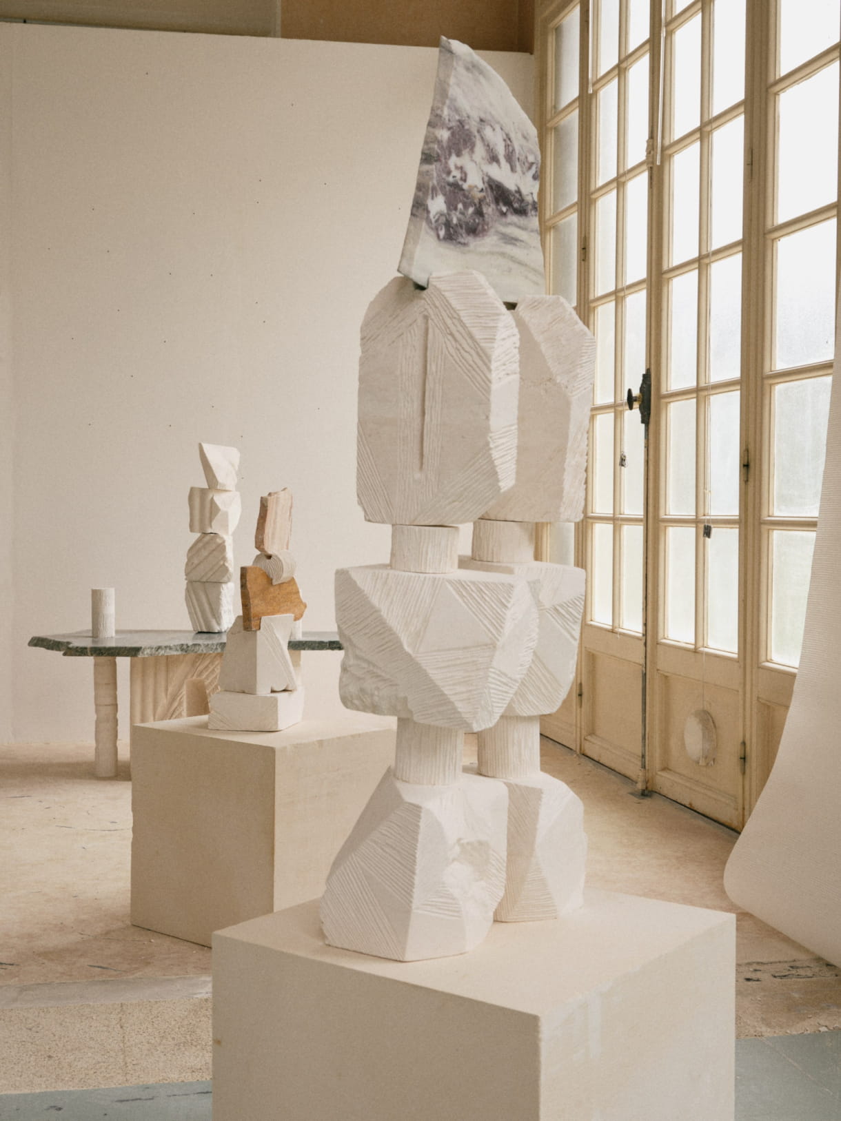 For the magnificent space on rue Bachaumont, I'm presenting a body of work ranging from seats and totem poles to smaller sculptures. Something Emma François-Grasset, the founder of Sessùn, said struck me when we talked about the spirit she wanted to instill. She said: "Carry on making your little houses", and it is going to be the case, each piece and stone is a world in itself, dialoguing with the others and creating a dynamic, vibrant harmony through the interplay of shapes and types of sculpted stone.
