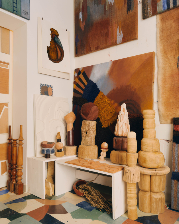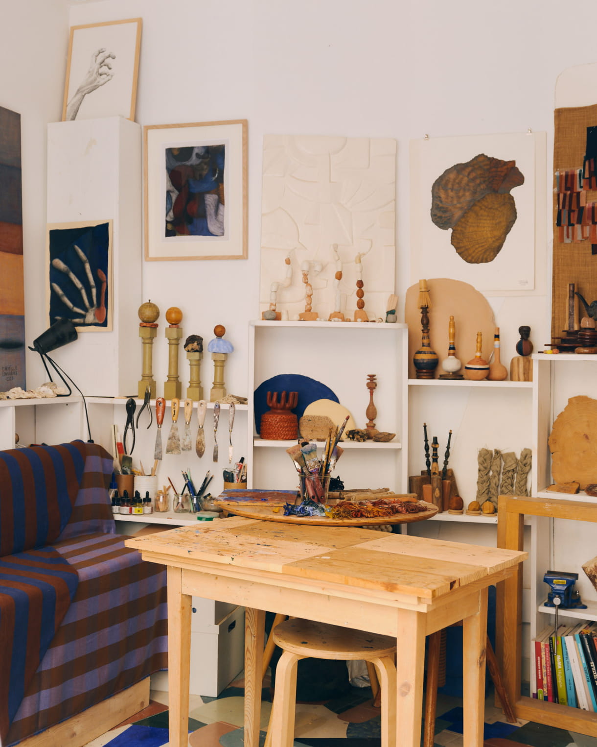 Today, in her workshop, which she describes as a cocoon crafted with her own hands, every surface