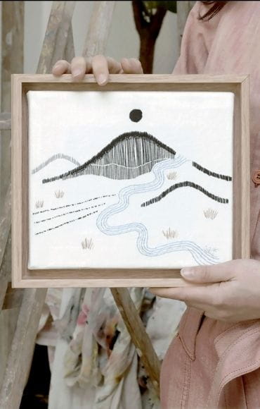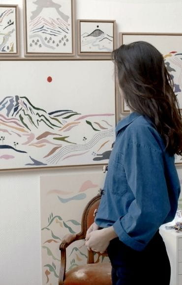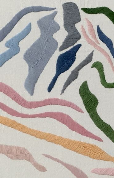 The landscapes that I embroider are the interpretation of a moment, a perception of a place. They are also the result of long observations – either real or from photos that I took – to see even farther, to be able to multiply the points of view, to blur perspectives and to represent this location in a different way each time. These shapes and colours express the desire to represent, the desire to share my sensations of these horizons. I also draw inspiration from images. I have so many influences: Georgia O’Keeffe, David Hockney, Japanese woodcuts, Nicolas de Staël, choreographers such as Martha Graham and Pina Bausch… But I especially like to discover archived illustrations and images: antique stones, illustrations from the Middle Ages, in Europe and Asia, engravings of the cosmos, architectural details, frescoes… Sometimes it’s just a fragment of a piece that lights a spark and gives me an idea.