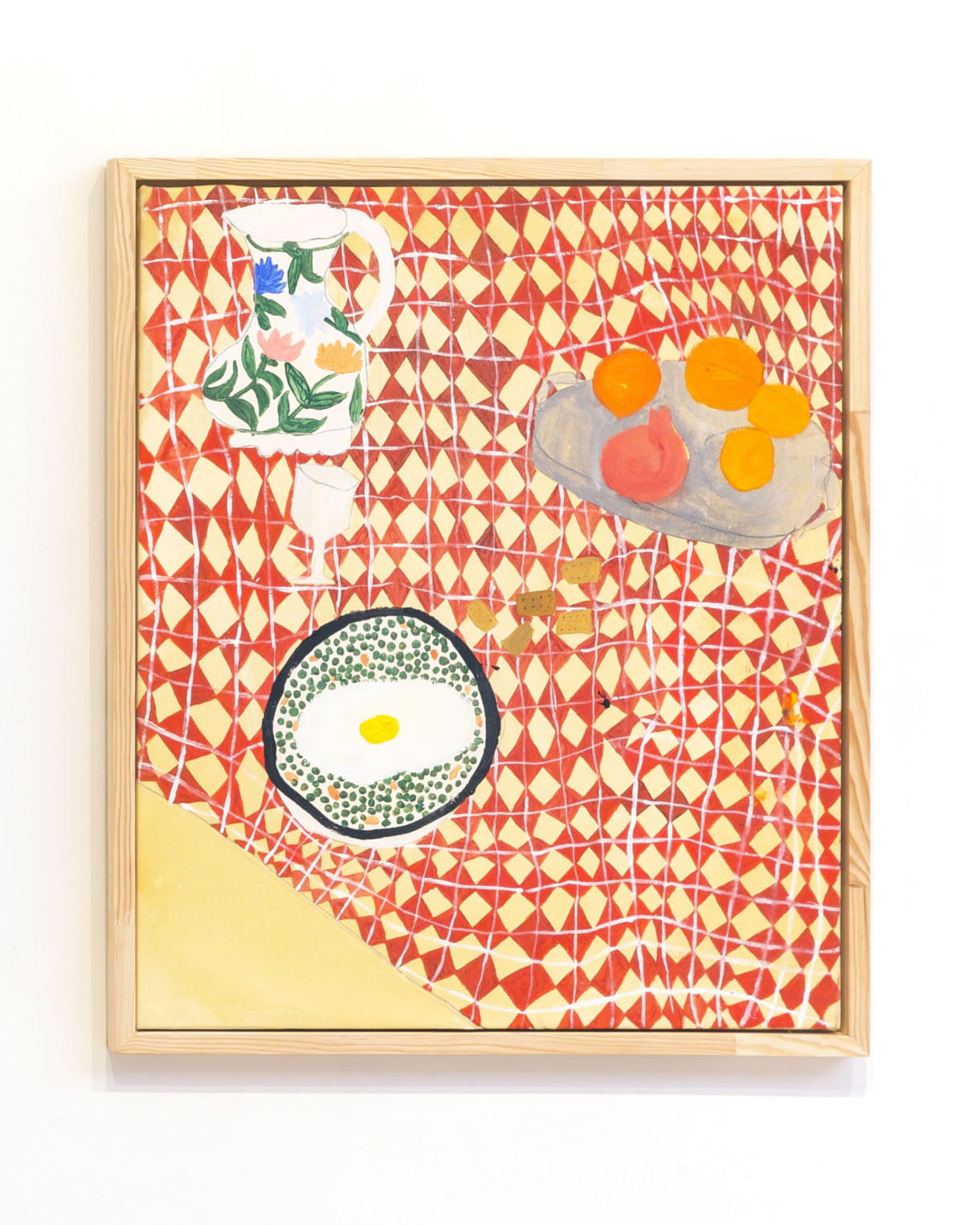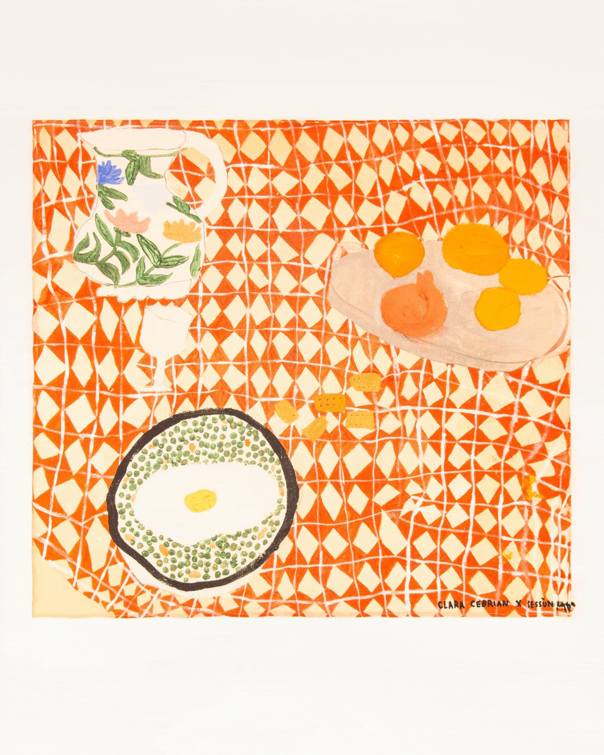 Every item in the painting tells a story: the tablecloth was bought in Kenya during a missionary trip I took at age 20; the jug is from my mother’s home, the one I was born in, and she gave it to me when I moved into my own place, to make it feel more like home; the silver fruit bowl belonged to my father’s family and is something I use every day. And on the plate, my usual solo lunch: peas with onion, bits of ham, and a fried egg on top. A little celebration.