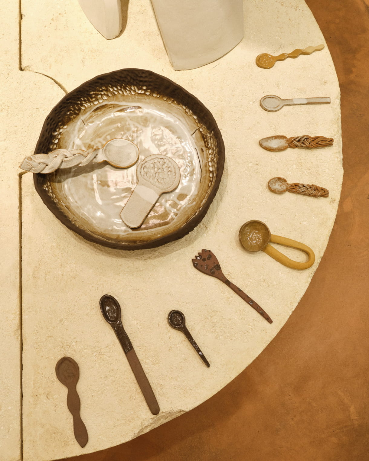 "I also wanted to get out of my comfort zone, which is turning my pieces on the potter's wheel, and use the technique of columbine modeling. It's a slower way to create: by using this technique, I wanted to take the time, to slow down our busy lives. Like when we are with family or friends. The idea for the spoons came later because I was looking for a way to accompany this dish. And this utensil was an obvious choice. To twist their shape, I was inspired by ethnic wooden spoons.