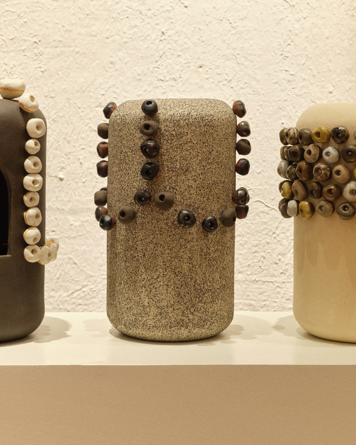 For Sessùn Alma's carte blanche, she imagined three large decorated vases with rounded shapes - Le Calcaire, Le Basalte and Le Jasper (Limestone, Basalt and Jasper) - and covered their surface with small enameled "pebbles", like those you pick up during a stroll.