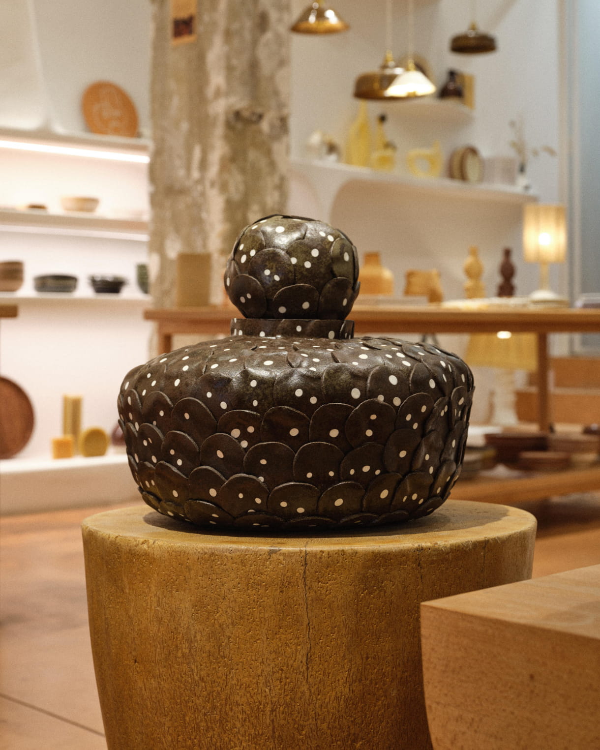 "My Pet Bottle is the result of a reflection on domestic ceramics, or how to create an affectionate piece with which one would want to live, to share the same living environment. The idea of the pet ceramic, echoing the family pet, was born. It is very organic; one can almost visualize it breathing. Its shell, between the scales of a pangolin rolled into a ball and the black plumage punctuated with white dots of an African guinea fowl, appears like a second skin. This piece is intended to stimulate the imagination.
