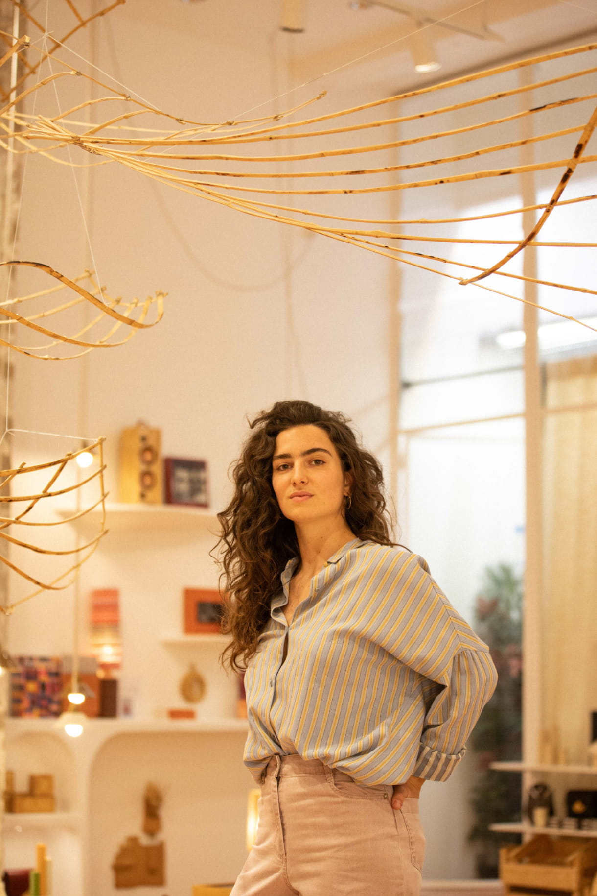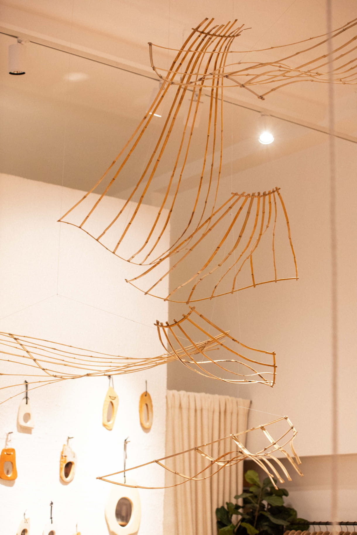 When I first visited the Sessùn Alma store, I was immediately struck by the volume of the space. I love how the restaurant entry acts as a passageway, leading into the heart of the store, a large open space with five meter high ceilings. With this scenography, I wanted to highlight that volume. My suspended structures invite visitors to look up, to observe the surrounding space in all its height, letting their gaze wander among the intertwining graphic lines. I hope it offers a moment of unexpected observation and daydreaming.