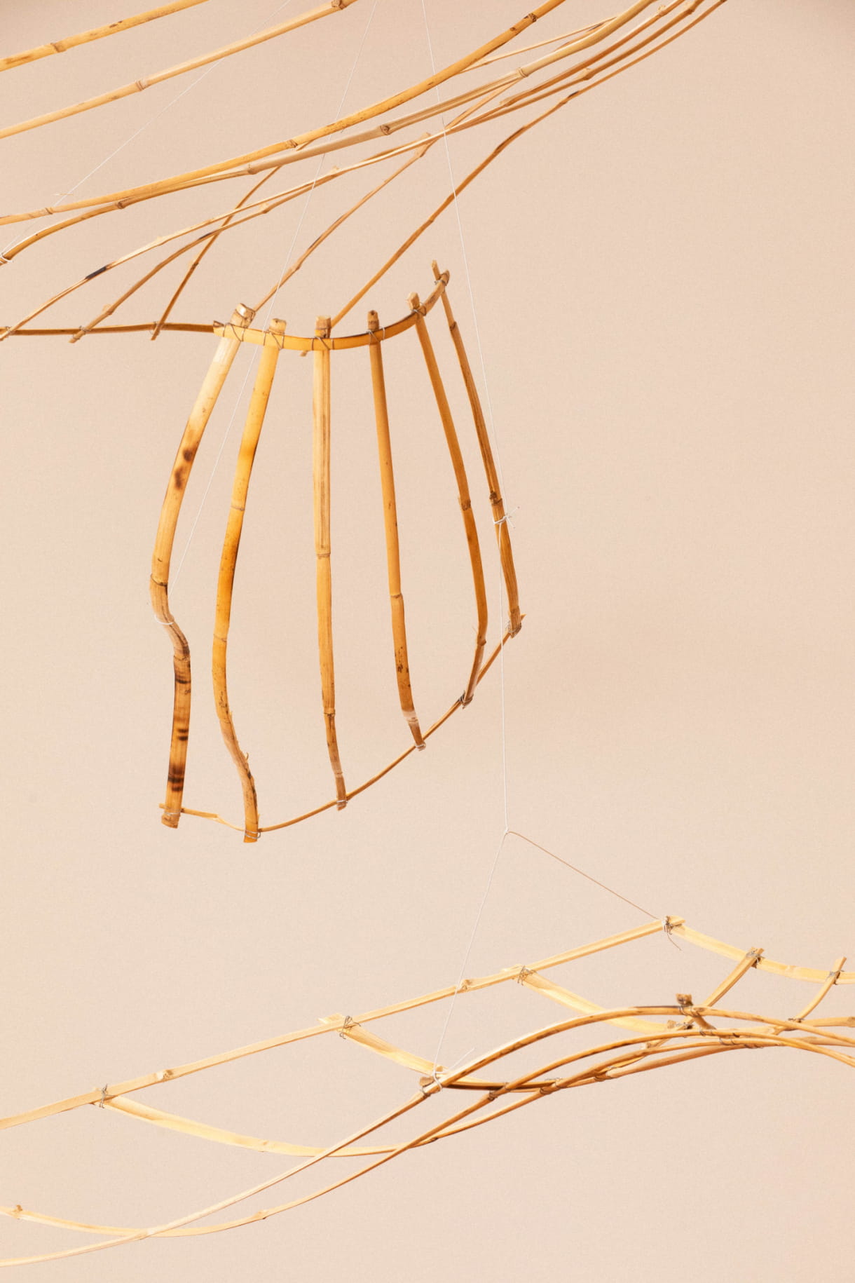 For the Alto project, I start by sorting the reeds by size and color. Then, I assemble them in different directions, like a game, each new experiment leading to another. The final form of the object emerges from the constraints and particularities of the material, but I also give myself the freedom to play with the drawing, whatever the surface. For this scenography, I worked with whole canes. Once stripped, I prepare long splints by cutting along the grain with a knife. By humidifying them and using heat from a flame, I can shape them as I wish, creating graphic and delicate forms that balance gracefully in their curves.