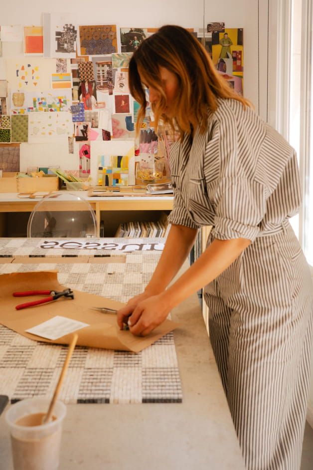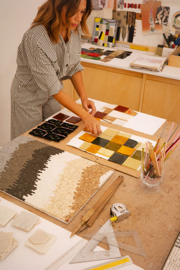 Born in Morocco and grew up in Barcelona, Kautar Larif has been shaped by the artistic richness of these two worlds. Influenced by masters such as Gaudí, Miró and Adnan, she has forged a unique style that blends tradition and modernity. Her career, marked by experiences in Barcelona and Paris, has enabled her to develop an innovative approach to mosaics. Her recent creation for Sessùn's Paris flagship perfectly demonstrates her ability to fuse bright colours, geometric shapes and cultural heritage. This project illustrates Kautar's mastery of transforming ideas into harmonious and inspiring works of art.
