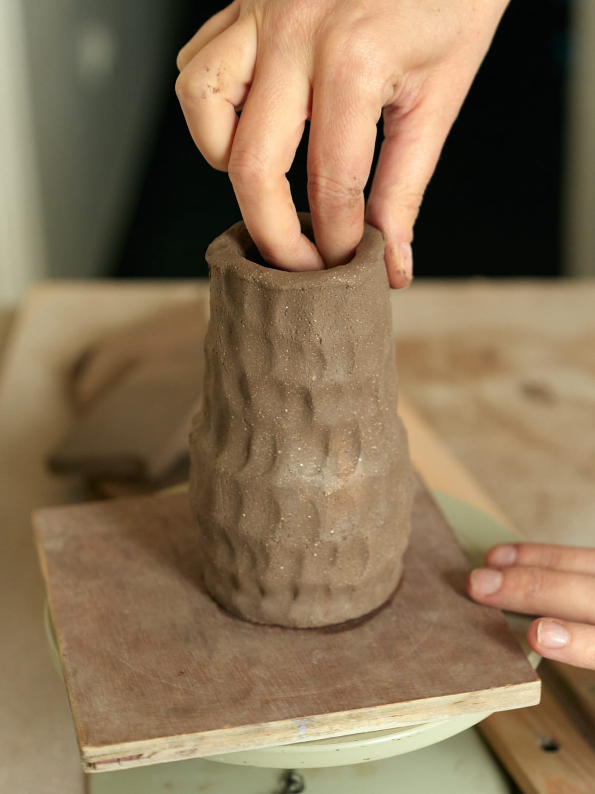 I work mainly in modeling, often combining different techniques on the same piece, like pinching, slab building and coiling.