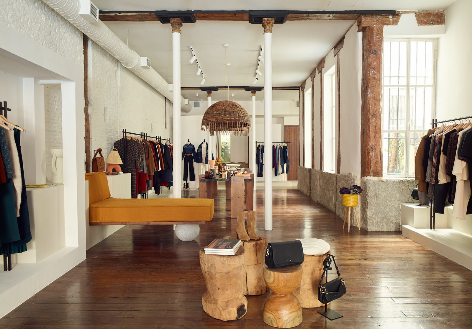 Wandering around the neighbourhood, we then fell head over heels for a location delicately positioned between a florist, a yoga studio and a number of wonderful little restaurants. This 200m² space still retains all of its memory and identity. Its soul and its history are reflected through the granite wainscoting, the wood floors and the typical Madrid pillars, around which the rest of the space has been designed.