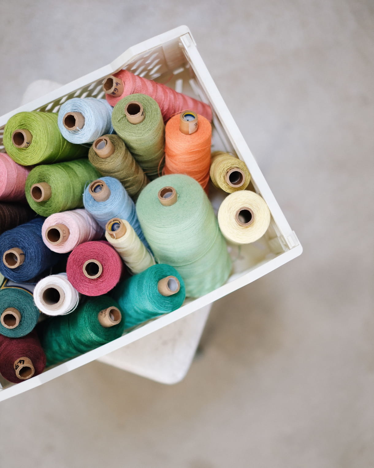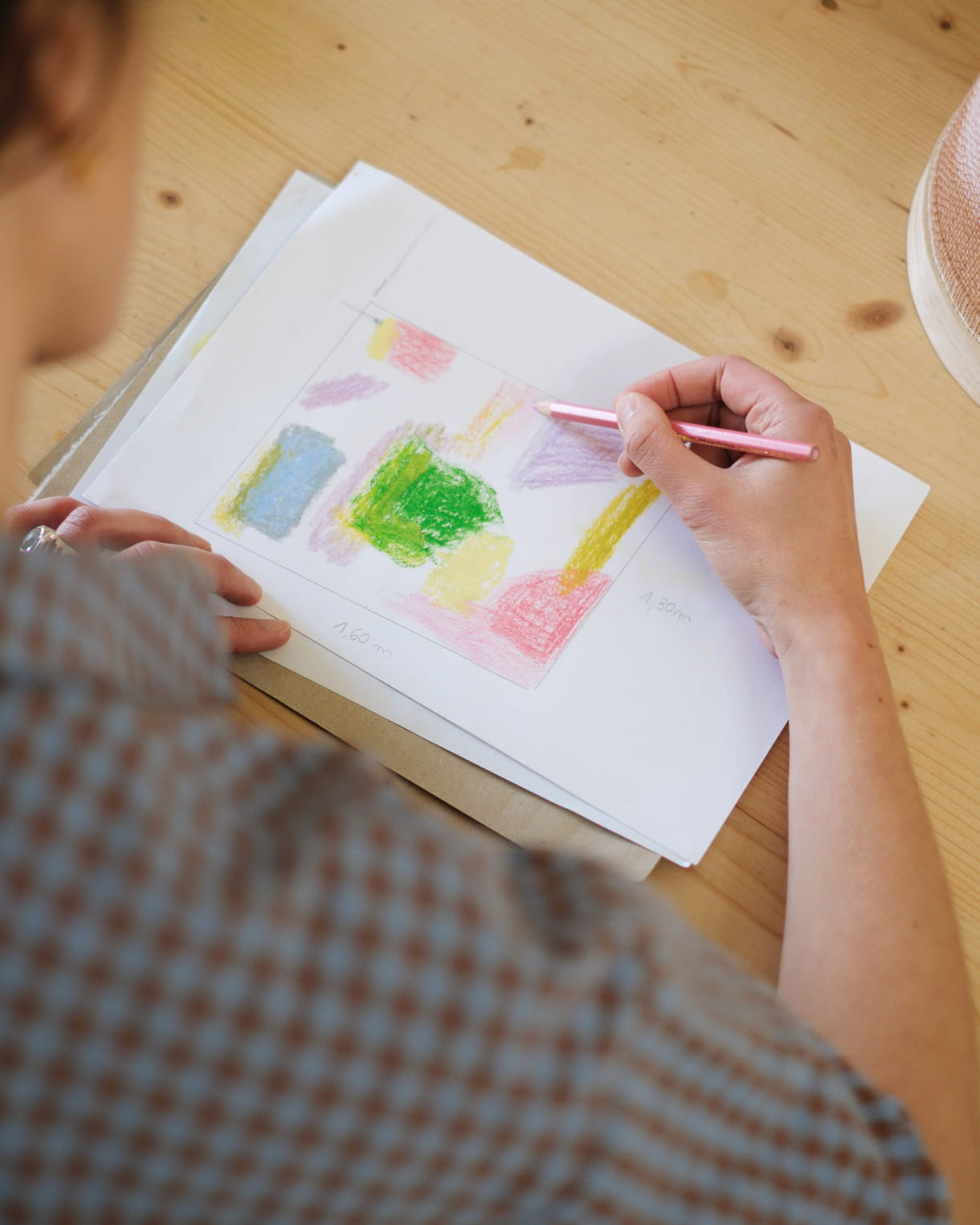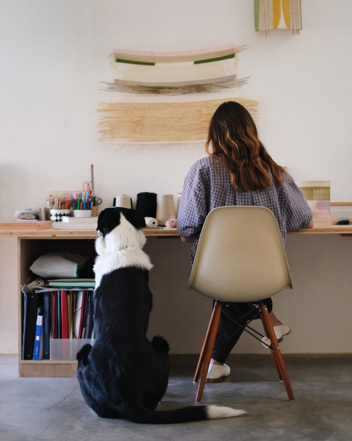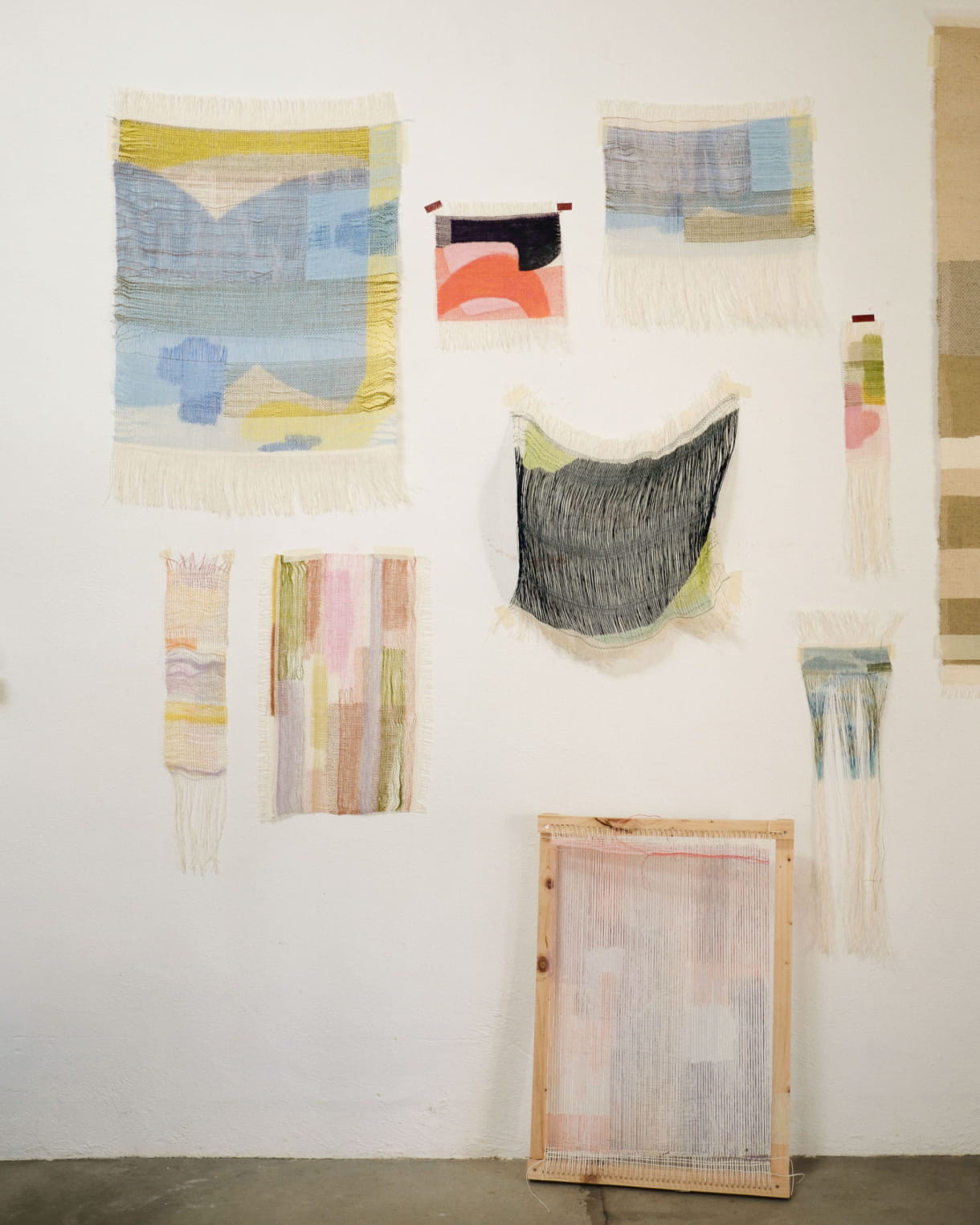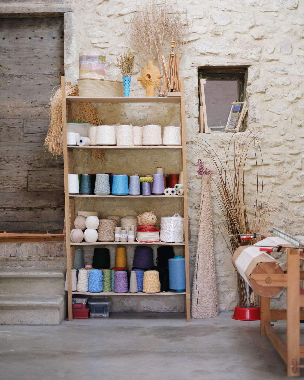 There's an old wooden loom, surrounded by weaving tools like shuttles and spools of natural thread (linen, paper, hemp, wool). The walls are often covered with ongoing projects, areas of research, fabric samples and, most of all, drawings. I've also made space for my "colour lab", where I prepare my inks. Here, I keep dried plants, a set of scales, pigments, containers and brushes. And, of course, a number of art books that inspire by day-to-day work. A book by Etel Adnan or a guide to natural colours is always close to hand.