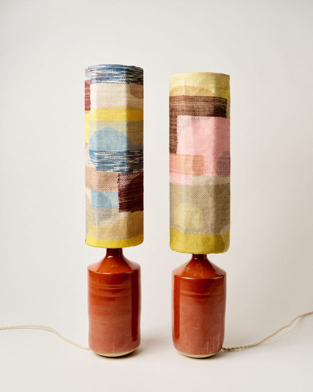 I really love the world of Sessùn. The richness of the materials, colours and textures, as well as the celebration of craftsmanship and the close bonds with art and artists’ studios. I saw a link between Sessùn and my own work: the range of colours, the artists they work with. It was a no-brainer to me; I wanted to continue my work exploring colour in a very intuitive and spontaneous way, like painters with their palettes. I came up with two colour palettes and designed two free-form visuals inspired by this imagery. The Ezia lamp offers great freedom for creativity thanks to its square, elongated shape, so I just treated it like one of my woven canvases.