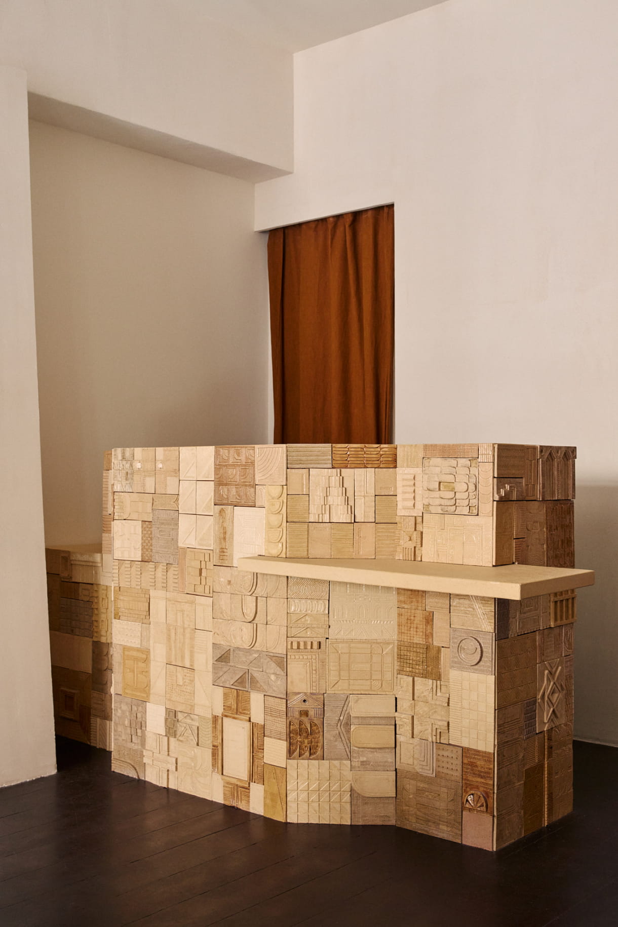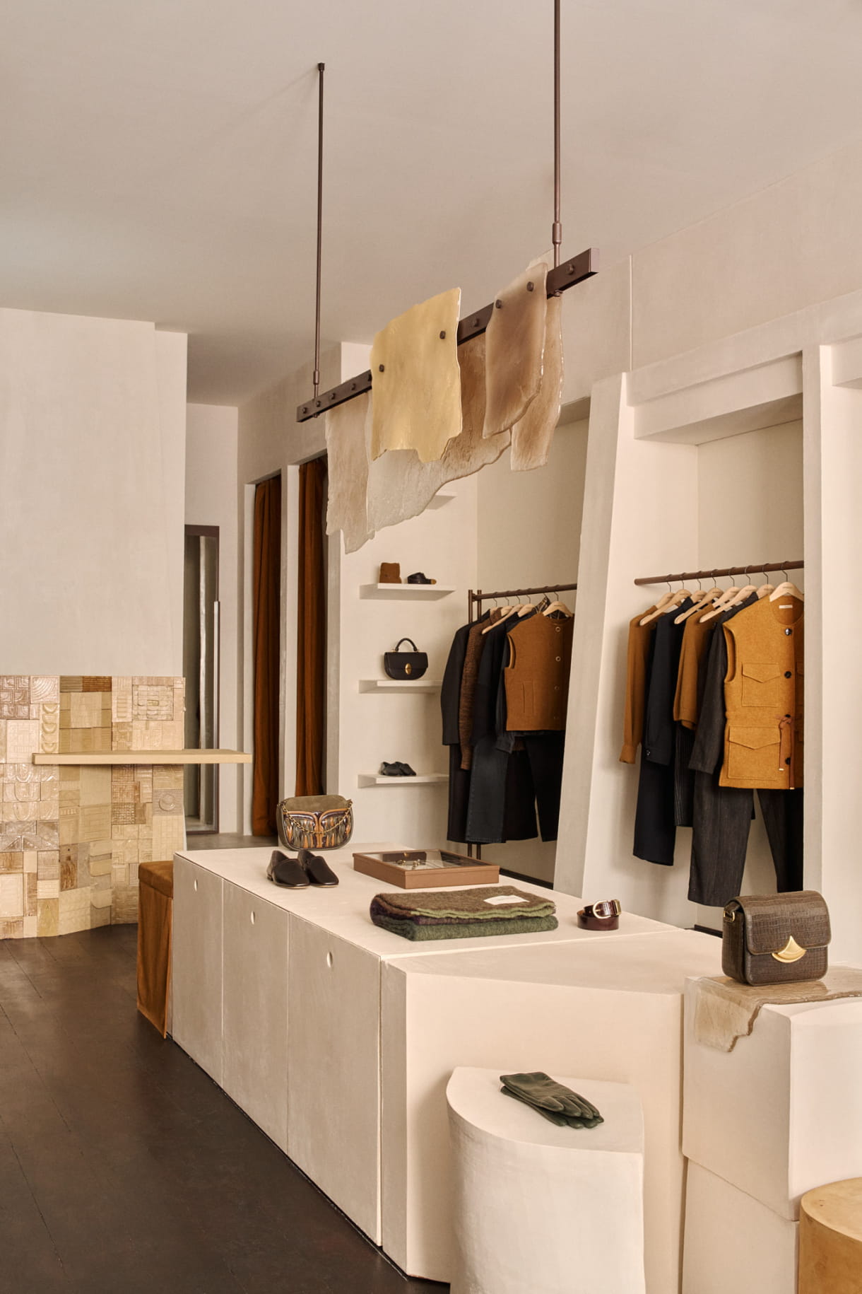 Totem-like plinths crafted by sculptor Léa Bigot punctuate the boutique, forming a central island reminiscent of organic display structures. The cash desk is adorned with hand-shaped and hand-illustrated tiles by ceramist Victor Marqué. The luminous glass-paste suspension at the heart of the boutique, along with several platter pieces adorning the plinths, are created by artist Claire Pegis.