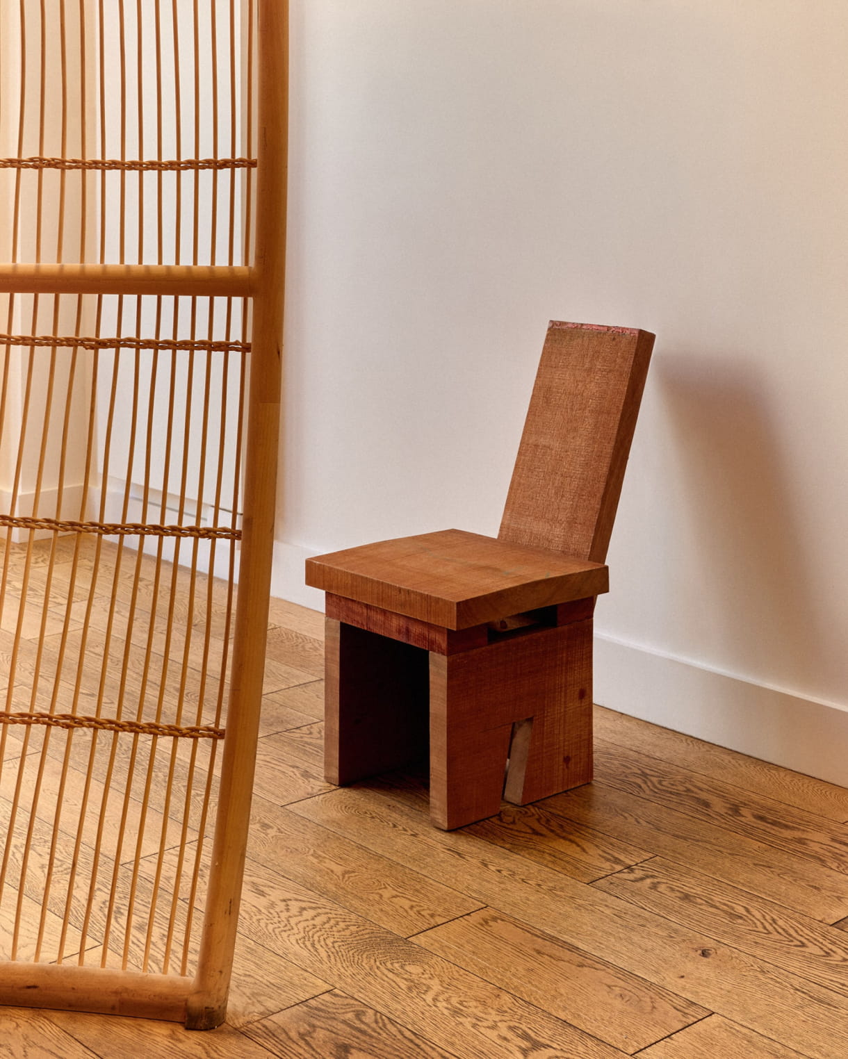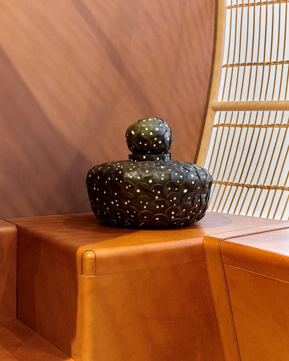 A cocoon, designed by the Jean-Brieuc workshop and made up of several hundred pieces of beech wood cut out and organised like a jigsaw puzzle, houses a selection of objects and accessories. It was in this cocoon that the exhibition was presented from 7 to 16 September 2023.