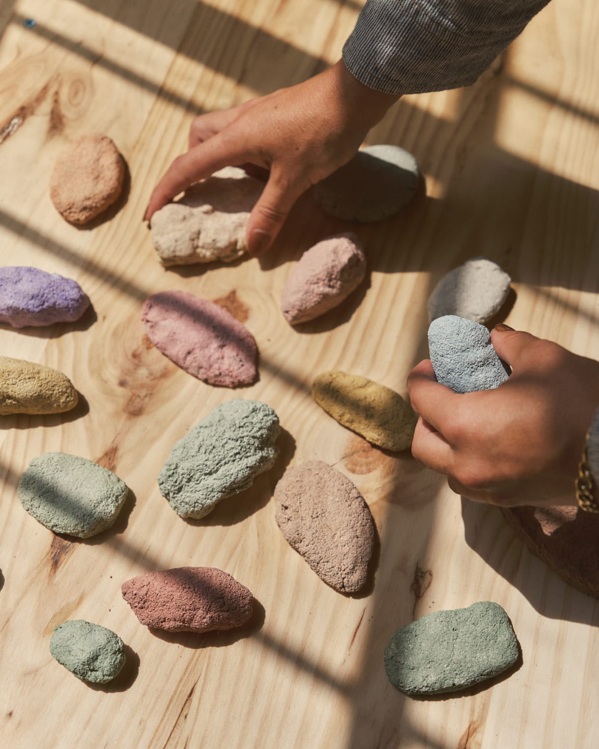 The process is entirely handmade. The waste material is torn apart by hand and mixed with other components to create a paste.The volumes are built up gradually by adding layers to increase thickness and incorporate color. The drying process takes a few weeks, after which the pieces are sanded and sometimes polished using different tools and methods. Finally, the piece is protected with an ecological varnish. It's difficult to quantify the exact time, but the production of each piece takes around six weeks.