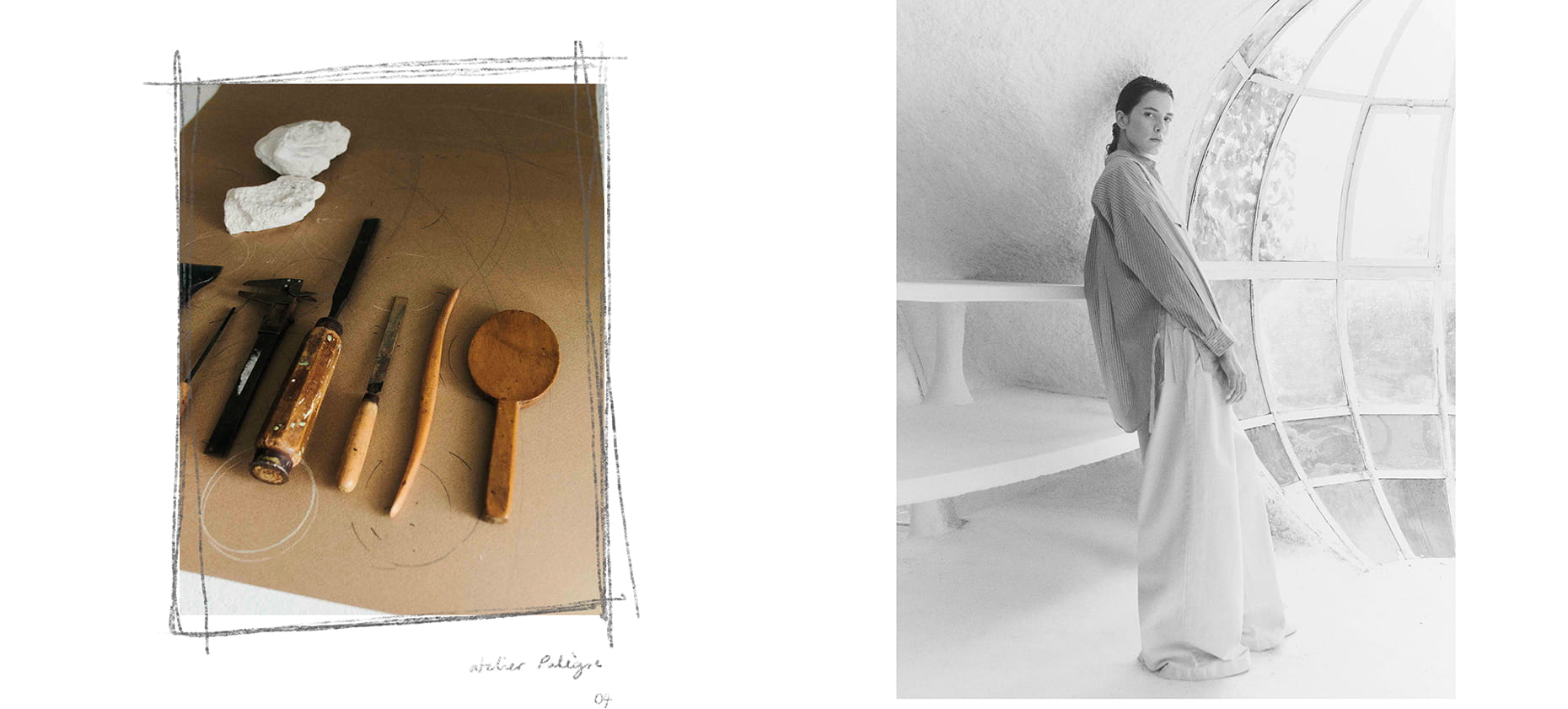 Office attire and utility wear—long cherished by the brand—are reinterpreted to showcase understated elegance, functional design, and stylistic accents that celebrate the art of creation. Smocks, artist blouses, and pocketed ensembles are crafted from blends of linen and natural fabrics, in shades of ecru and colors derived from vegetable-based dyes.