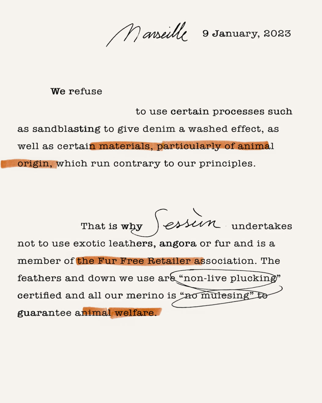 Materials are part of our history, our DNA. They are often what give birth to an idea, a model, a story. They tell the story of our know-how, our love of the garment... and its durability. That's why we choose them with the utmost care, while constantly questioning the impact of our choices. Several years ago, we decided to fully commit to transitioning to more responsible, less polluting fibers, produced under conditions that are more environmentally friendly and respectful towards people. We refer to them as lower impact materials. This year, we achieved 64% of lower impact materials in our collection.